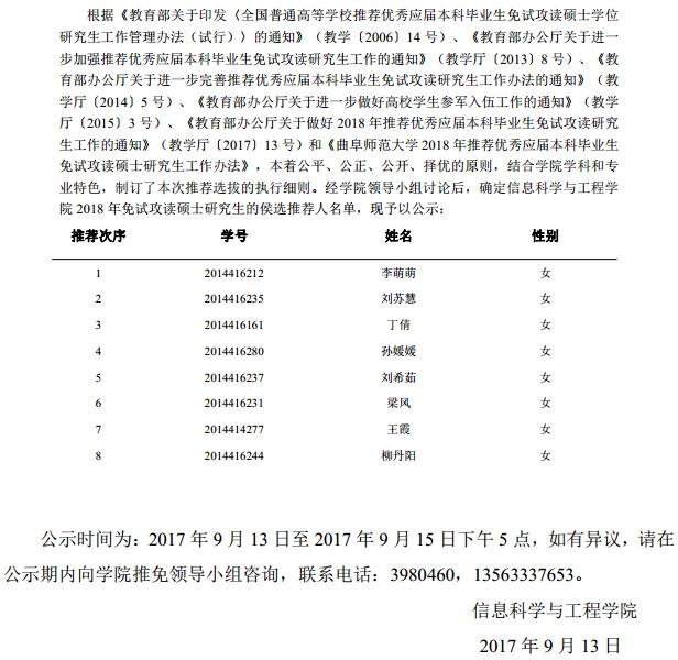 788-sb.com2018年优秀应届本科生免试攻读硕士研究生推荐人名单公示